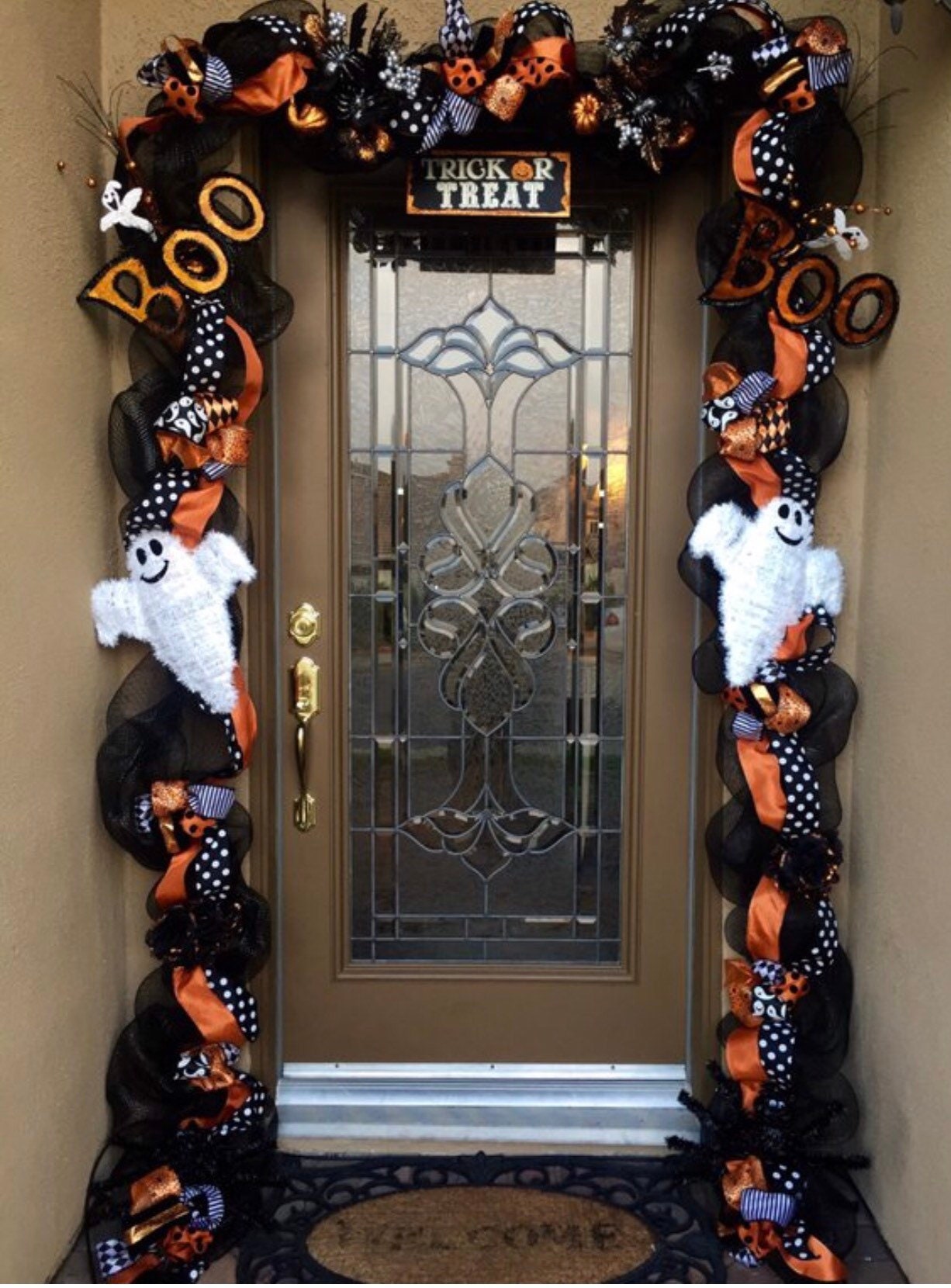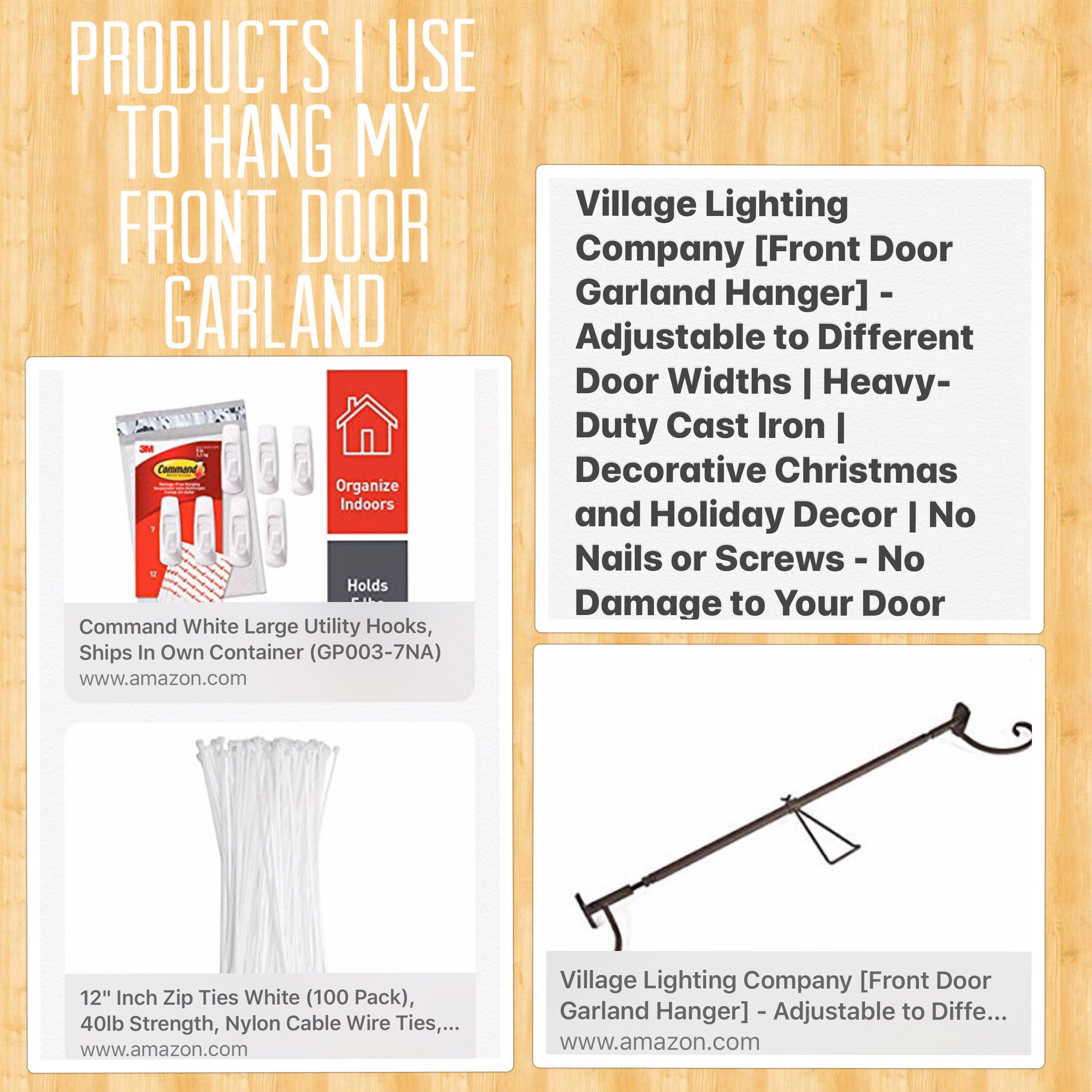 I use a removable door garland hanger along with command hooks that I purchase through amazon.